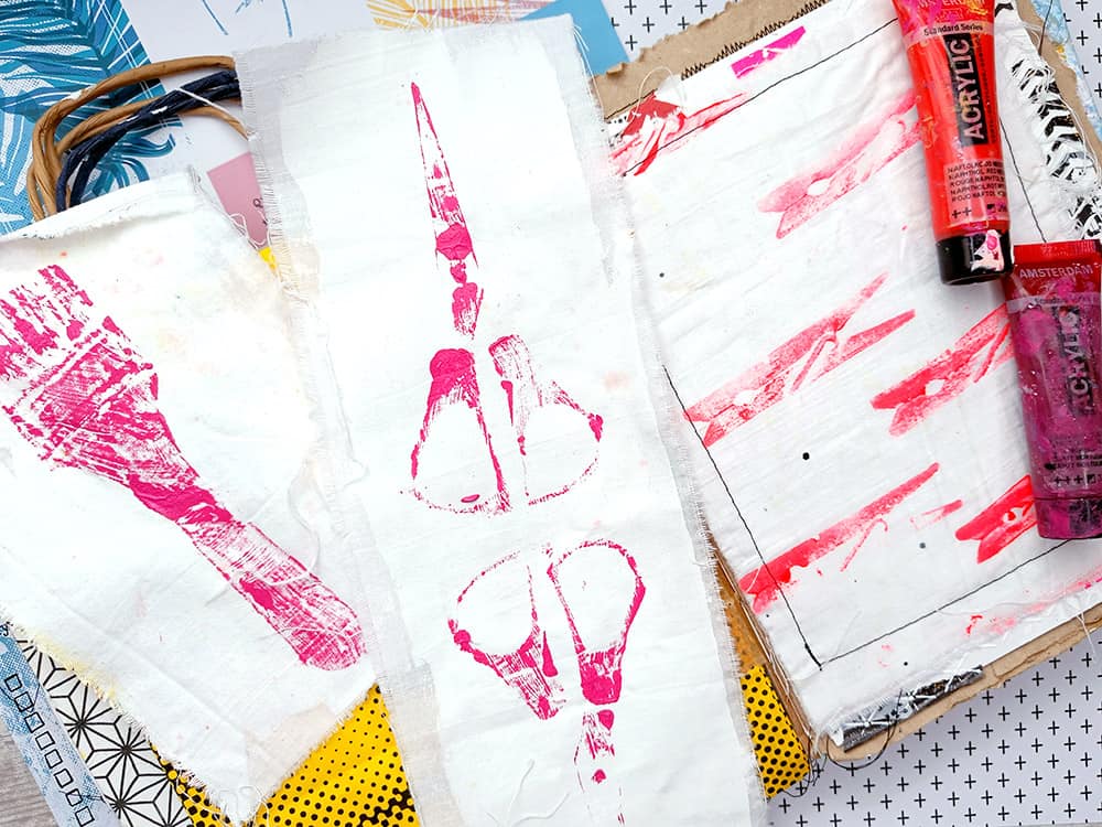 Y si la tela en realidad no es tan chula, le das una capa de gesso o dos y te haces un lienzo. Y ahí estampas plantillas, manchurreas, coses…