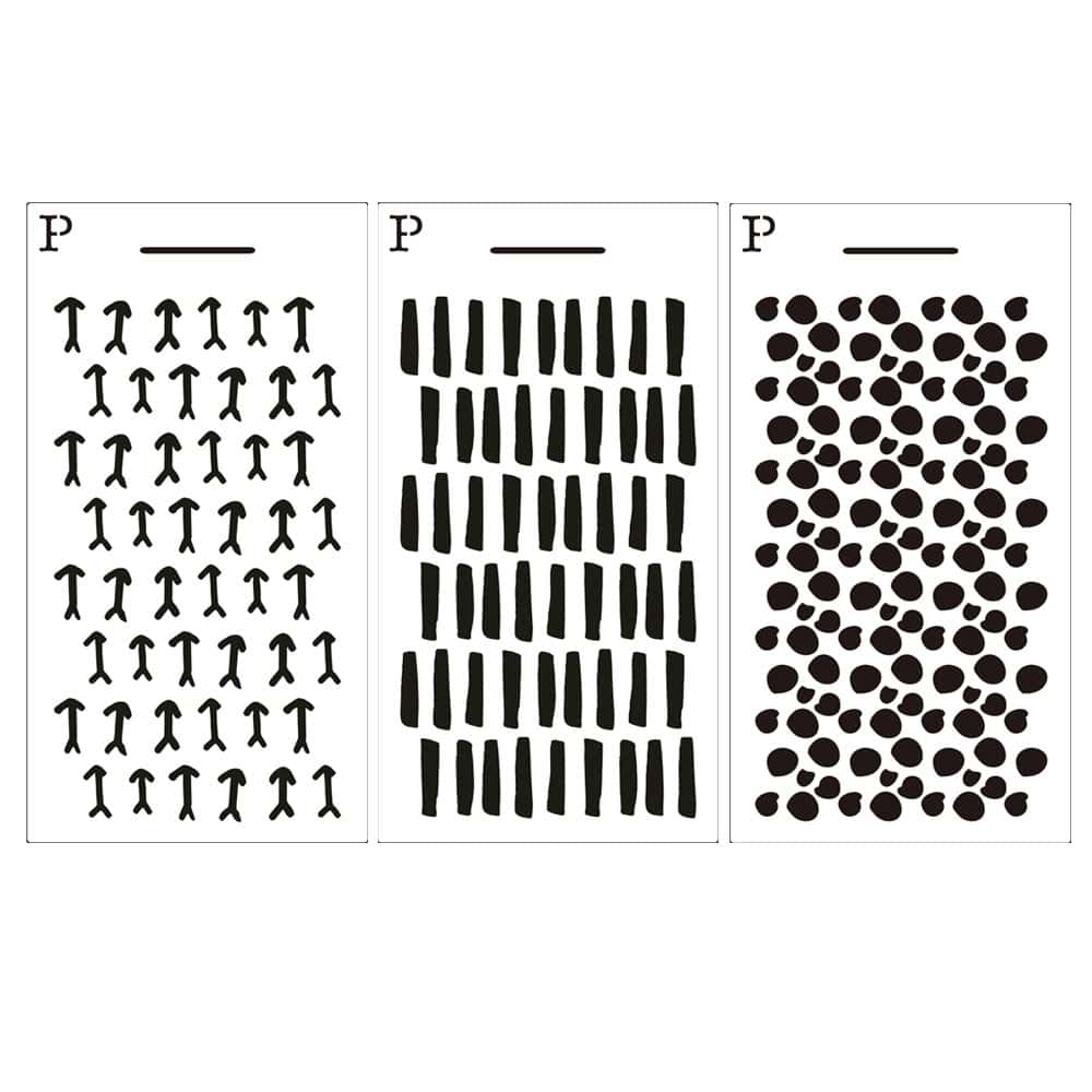 Lo que necesita una colección mixmediera e inspiradora como Paréntesis son dos juegos de plantillas con bien de mark making y de patrones a mano, para hacerte fondos infinitos y para dar toques de decoración.
