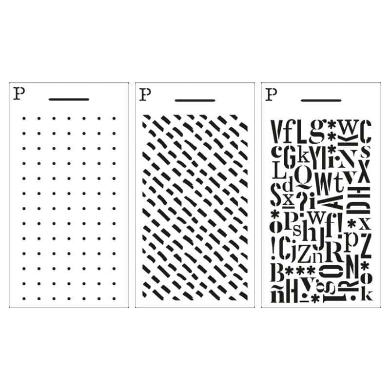 Lo que necesita una colección mixmediera e inspiradora como Paréntesis son dos juegos de plantillas con bien de mark making y de patrones a mano, para hacerte fondos infinitos y para dar toques de decoración.